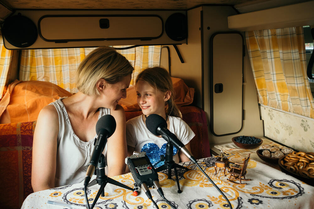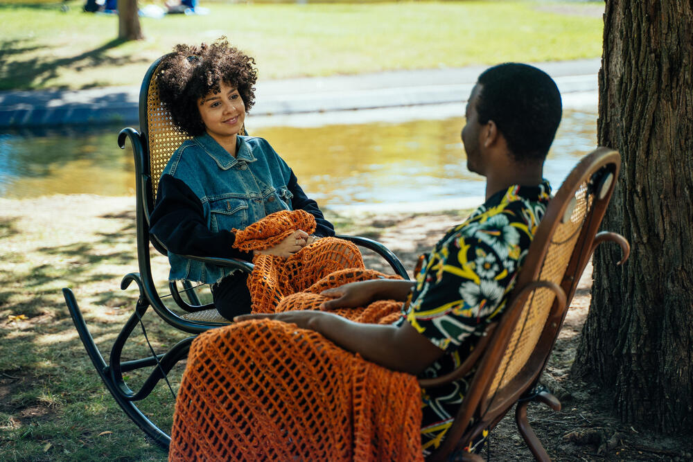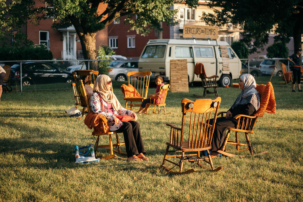 invite à une douce immersion dans l’univers des berceuses. Une quinzaine de chaises berçantes de tailles différentes animent l’espace d’un parc, un square ou un coin de rue piétonne. Munies de hauts-parleurs intégrés, elles chuchotent à l’oreille les airs glanés par les artistes depuis la création du projet. Car l’expérience d’écoute, introspective et joyeuse à la fois, se complète au studio d’enregistrement mobile aménagé dans un vieux Westfalia. Les participants sont invités à partager la mémoire chantante de leur enfance pour alimenter à leur tour le circuit des chaises. Se réactive alors l’héritage intime, collectif et rassembleur de la tradition orale des berceuses. Accessible à tous, petits et grands, l’installation transforme les chansons en matière de dialogue interculturel et intergénérationnel et dresse un portrait poétique d’une communauté.