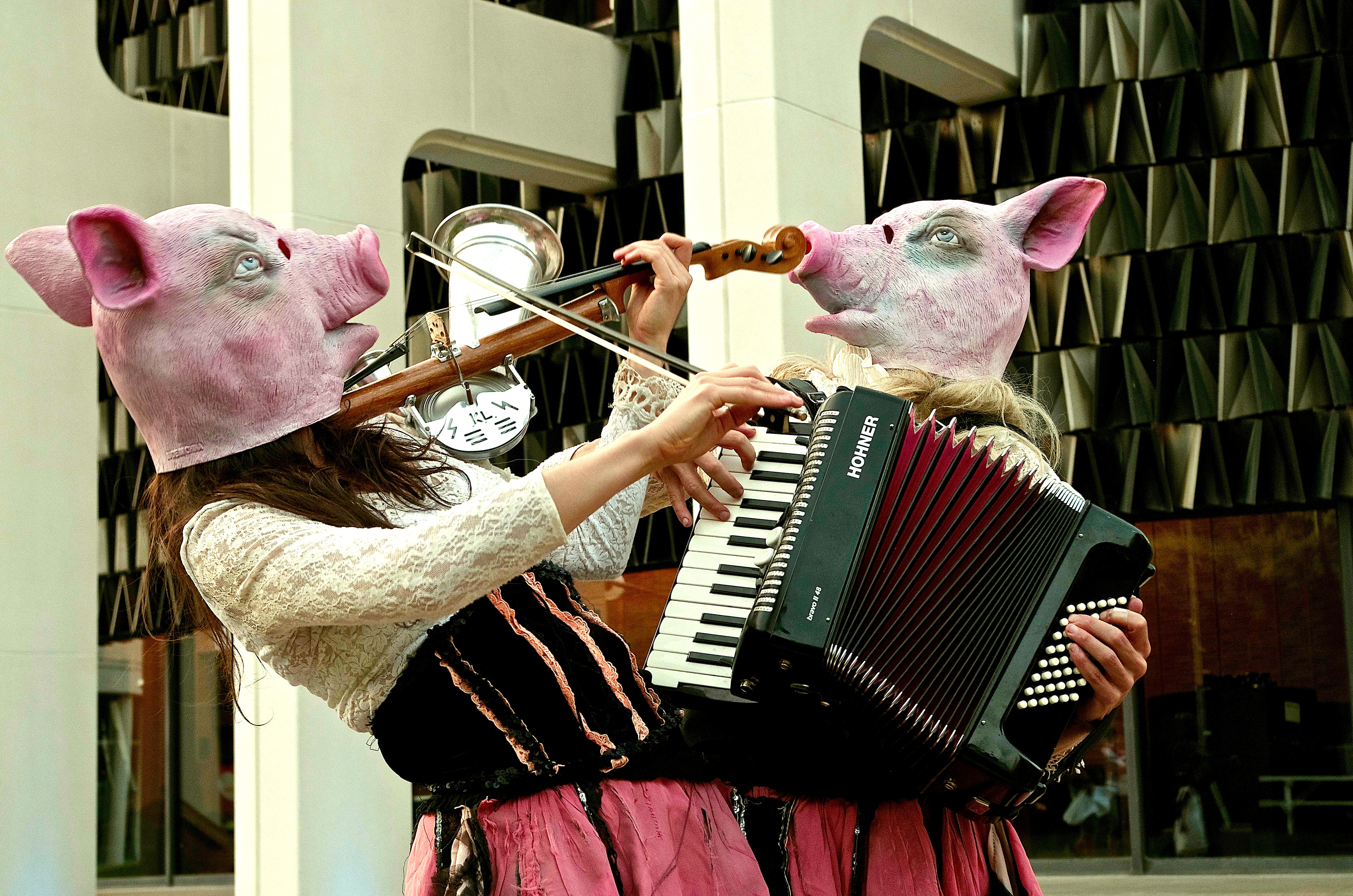 Ces Belles Bêtes, talentueuses instrumentistes, explorent en musique les difformités humaines (nanisme, gigantisme, bête mi-homme mi-animal, déformations génétiques) le rapport à l’autre (proximité, dépendance, complicité), au corps (obésité, féminité, masculinité, ambivalence des genres). Ainsi, différents personnages issus de mondes imaginaires déambulent toujours en rythme, en musique, en théâtre, en danse et en cirque.