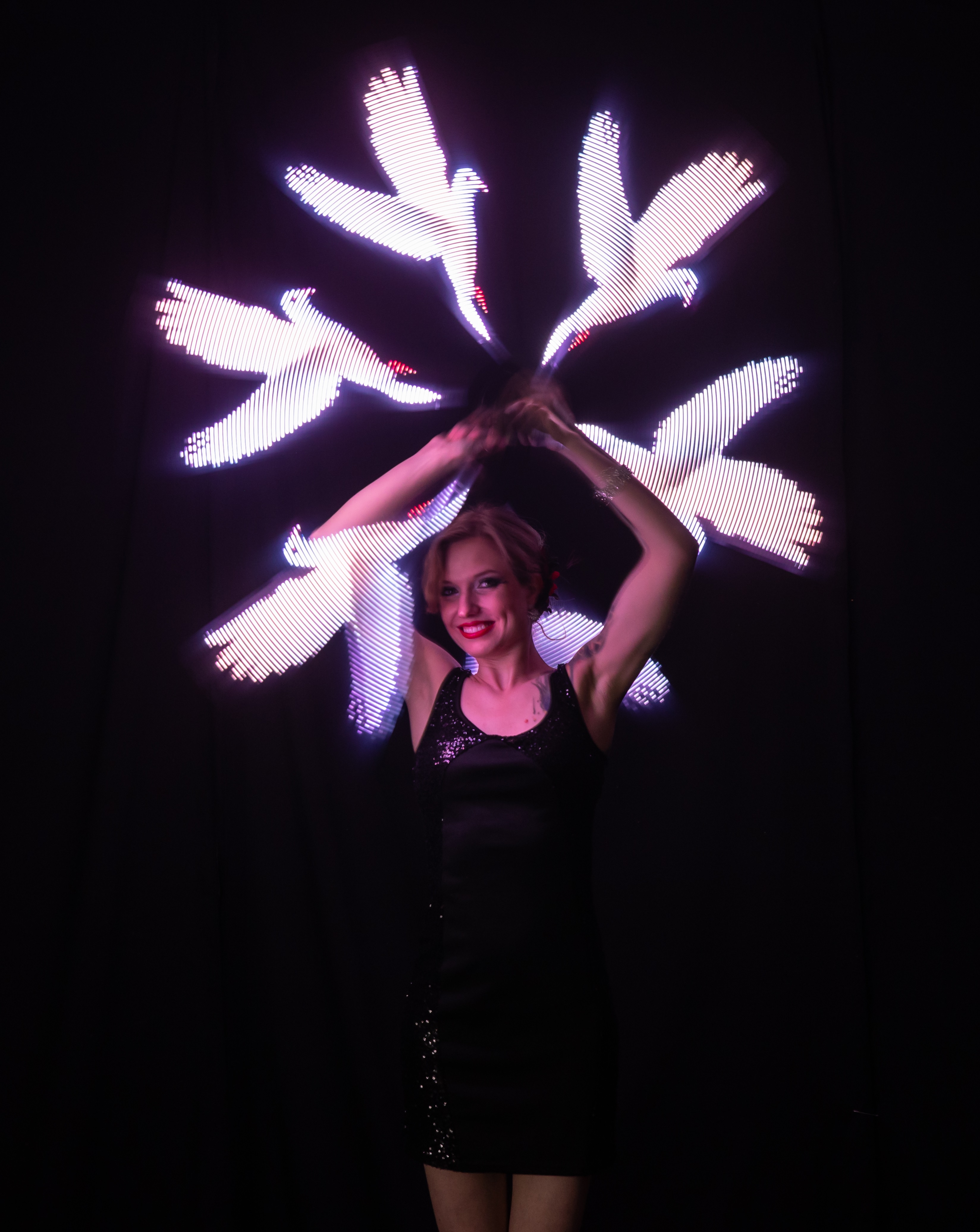 Louve offre des spectacles et animations lumineuses avec des instruments de jonglerie graphique. Il s'agit d'une toute nouvelle technologie en provenance de l'Europe de l'Est, qui permet de faire apparaître des images lumineuses dans les yeux des spectateurs.