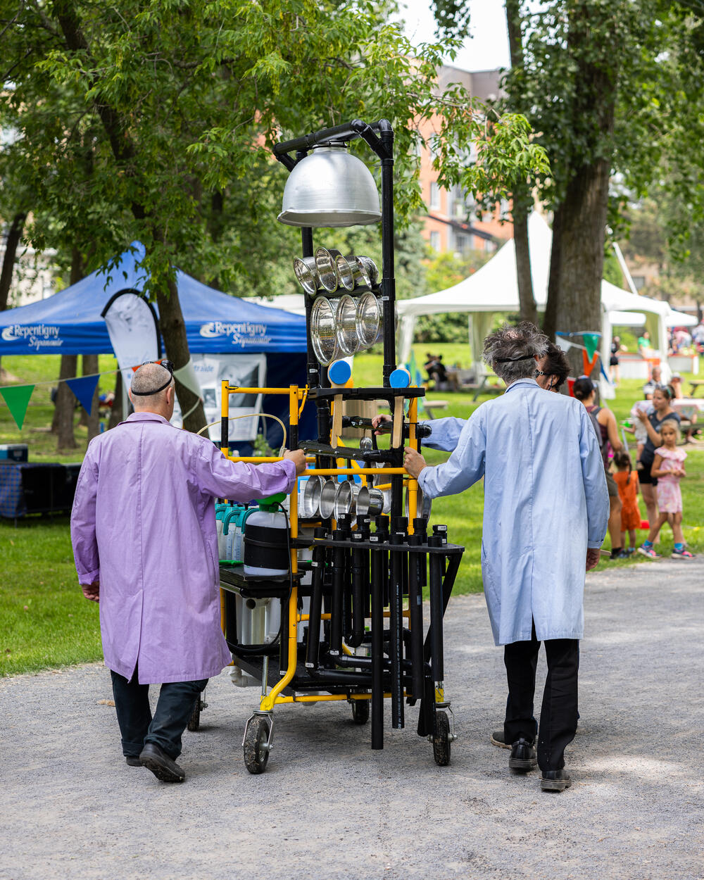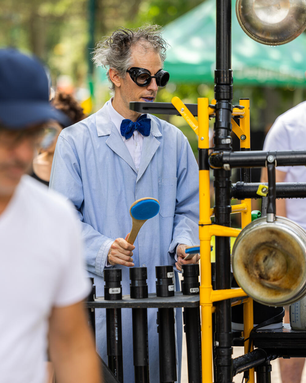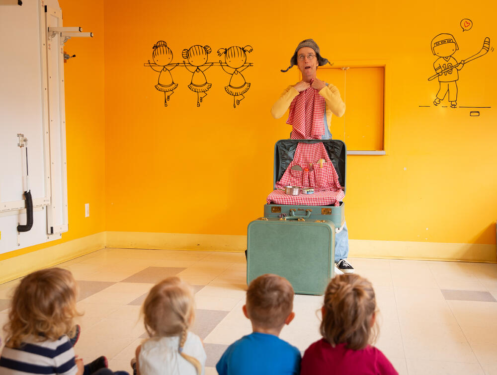 Dans nos spectacles, la musique vient renforcer et ponctuer le jeu physique des personnages. Jouée en direct, à mi-chemin entre le bruitage et la trame sonore, elle soutient et porte le discours émotif des artistes. Les rires et les éclats de voix des spectateurs, complètent cette musique. Cette conversation sensible entre l’artiste et le spectateur leur offre, à tous les deux, une expérience unique et palpable.