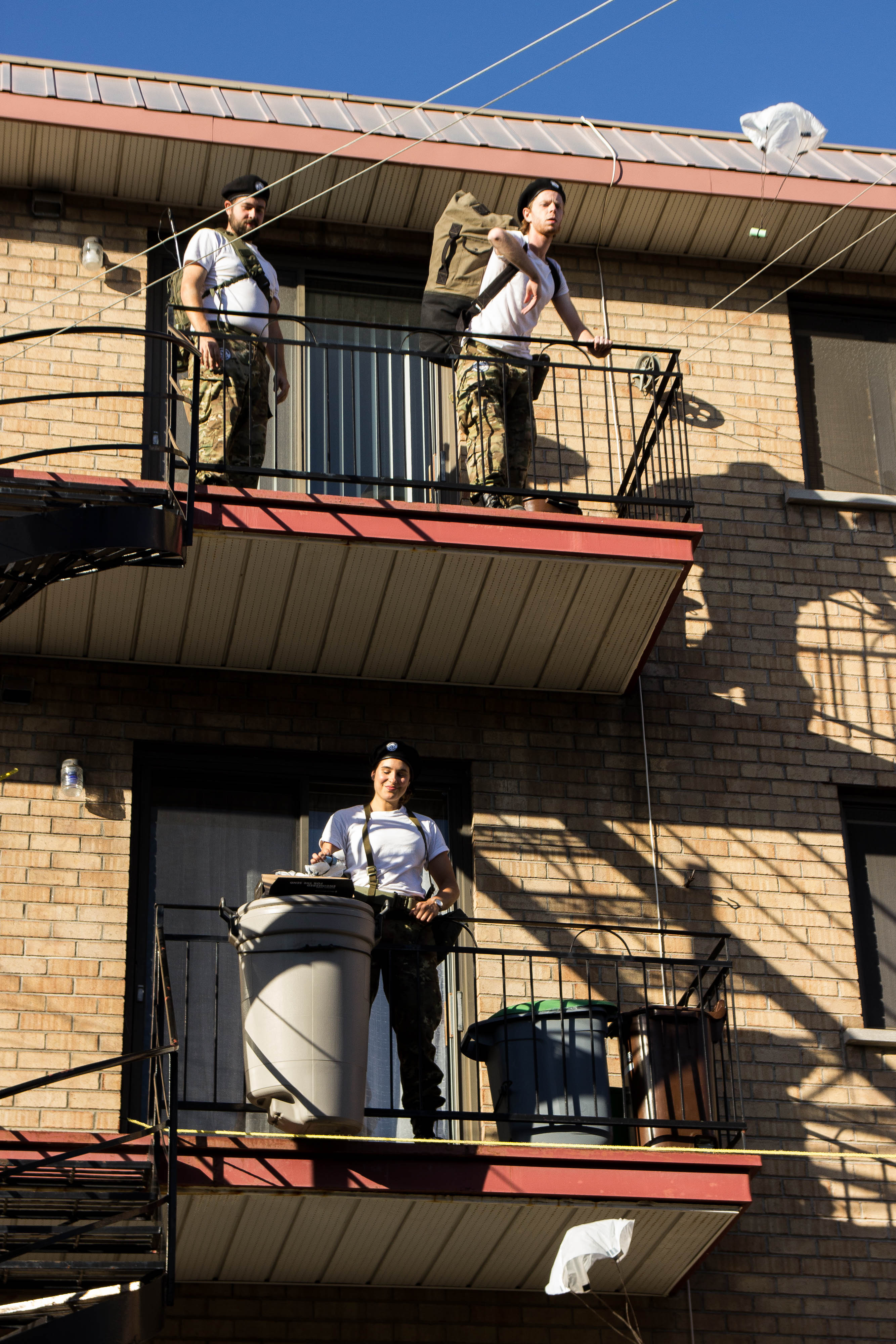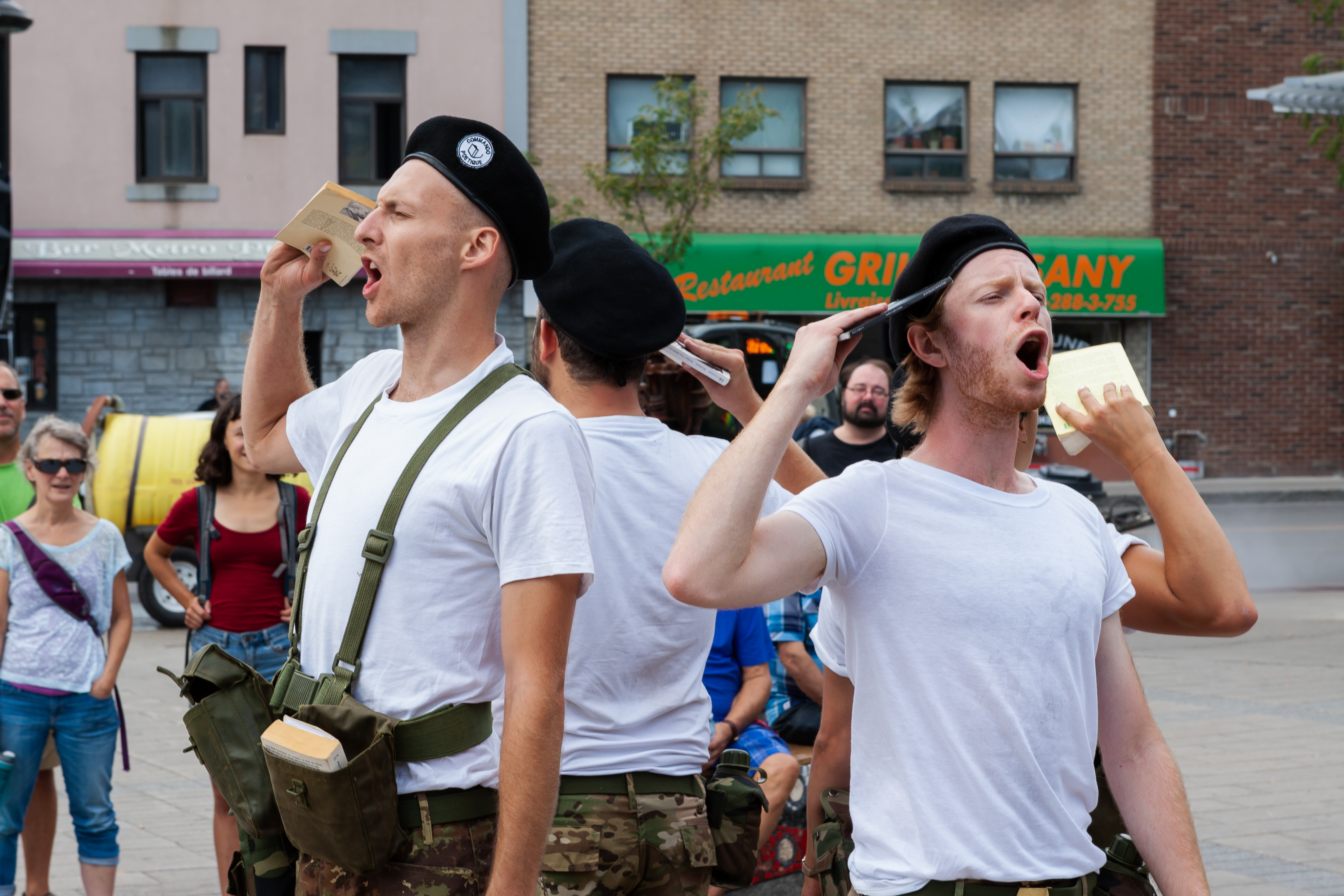 Utilizing poetic works is at the core of their work and at the forefront of their second performance Le Commando Poétique. Inspired by the mannerisms of soldiers, the performers become the defenders and the mouthpiece of poetry and literature. While dressed in military clothing, they differentiate themselves from the armed forces by wearing a sigil and by using their own choice of weapon: books.