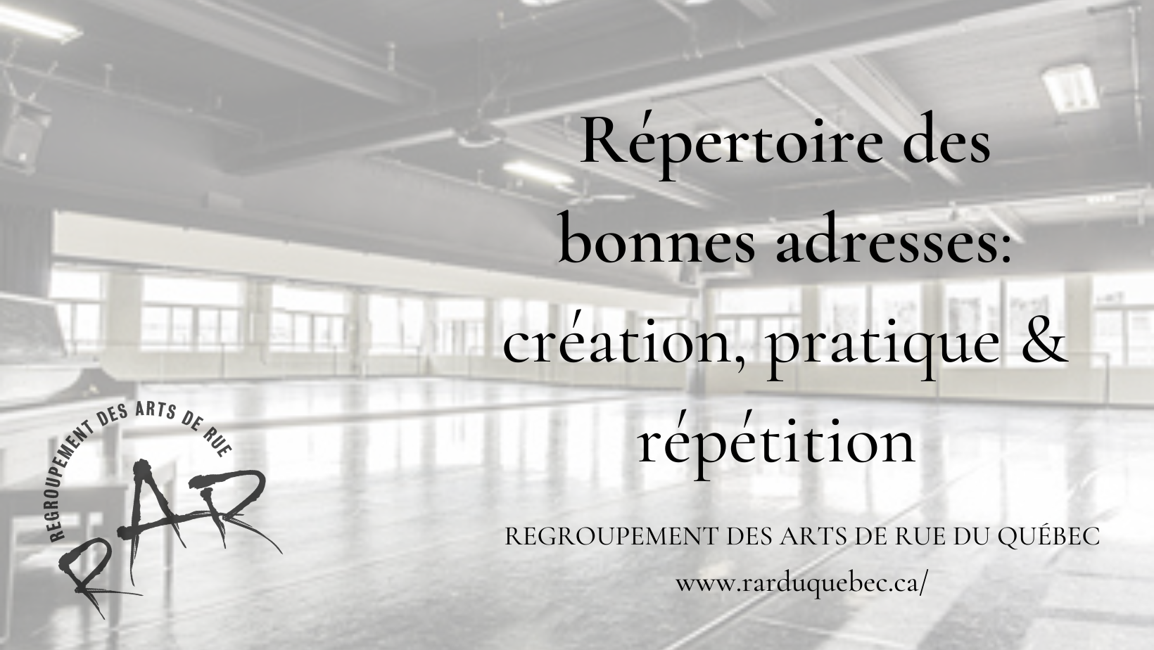 Parce que nous savons combien il est difficile de dénicher l'endroit par excellence où développer des créations dont la diffusion est prévue hors les murs, le RAR vous propose une liste de lieux qui sauront correspondre à vos besoins les plus pointus. Prenez note que cette liste sera régulièrement révisée et mise à jour.